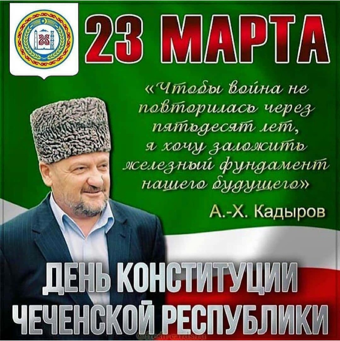 Ровно 18 лет назад, 23 марта 2003 года была принята Конституция ЧР. Инициатором проведения референдума был Первый Президент ЧР, Герой России Ахмат-Хаджи Кадыров (Дала г1азот къобал дойл цуьнан). Тогда народ выразил свое желание жить и развиваться в составе Российской Федерации. Состоялись выборы первого Президента в истории современной Чеченской Республики, где единогласно жители республики избрали своим лидером Ахмат-Хаджи Кадырова (дала г1азот къобал дойл цуьнан!) багослова и политика уже на тот момент доказавшего, что готов отдать собственную жизнь в борьбе за спасение своей нации. Благодаря этому историческому событию мы живём в мирной и процветающей республике! В этот праздничный день желаю всем жителям Республики мира и благополучия!